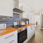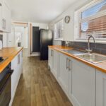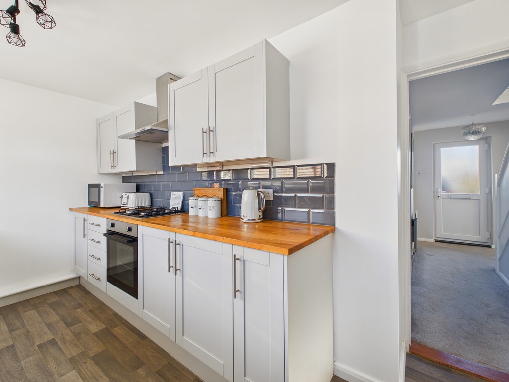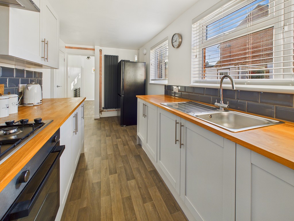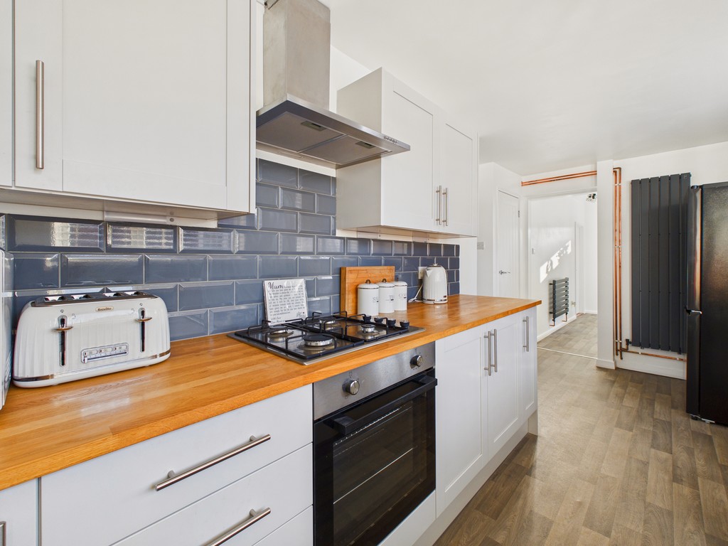 KITCHEN/BREAKFAST ROOM 17' 1" x 7' 3" (5.08m x 2.13m) The modern Howden's kitchen, less than two years old, with a pantry features a range of wall and base units, a gas hob with an oven beneath and an overlying extractor fan, and two double-glazed windows to the rear elevation with blinds. There is a modern upright radiator, space for an American-style fridge freezer, and provision for a breakfast bar. A door leads: