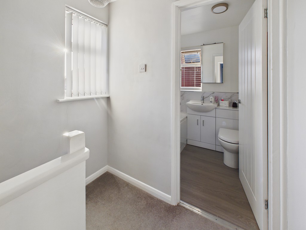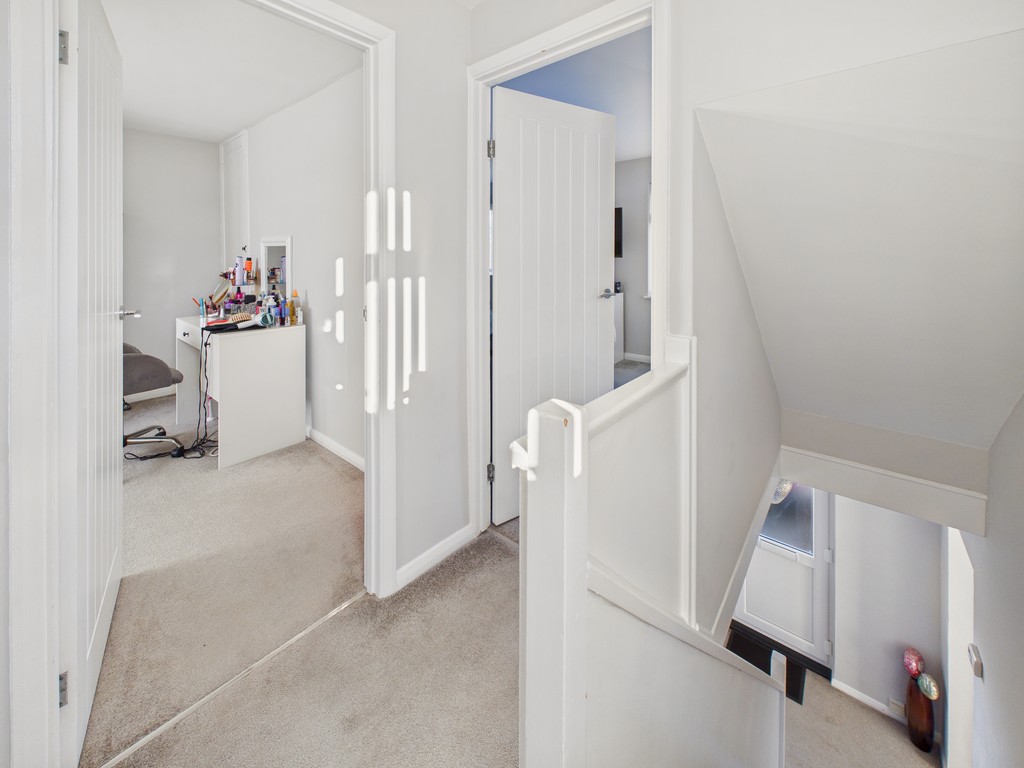 LANDING Light floods the space through a double-glazed window with a fitted blind to the side elevation. There is convenient access to the loft, and doors lead to the bedrooms, bathroom and additional storage, making the layout both practical and versatile