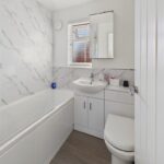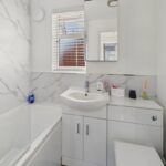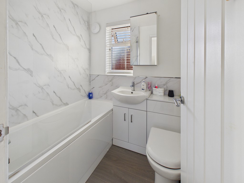 BATHROOM 5' 11" x 5' 3" (1.8m x 1.55m) This modern bathroom features a bath with an overhead shower and glass screen, a hand basin with convenient under-storage, and a low-level W.C. A heated towel rail adds comfort, while a double-glazed window to the rear elevation, complete with a blind, provides natural light. The room is finished with contemporary panelled walls, laminate flooring and a mirror storage unit, combining style and practicality.
