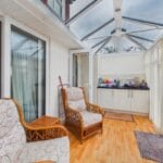 CONSERVATORY 18' 11" x 7' 6" (5.77m x 2.29m) The conservatory is fully double glazed and features vertical blinds, a pitched roof with recessed lighting, and patio doors opening onto the terrace. Large sliding double-glazed doors lead into the reception room, creating a seamless flow. Also benefiting from laminate flooring and a selection of storage cupboards with black work surfaces (ideal utility). A further double glazed door provides direct access to the kitchen, ensuring excellent flow and accessibility throughout.