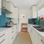 KITCHEN 10' 4" x 7' 1" (3.15m x 2.16m) A contemporary kitchen finished in neutral tones, featuring a stylish vinyl splashback and a smooth ceiling with recessed downlights. The space includes a built-in oven and microwave, a two-ring induction hob with overhead extractor, integrated fridge freezer, and dishwasher.