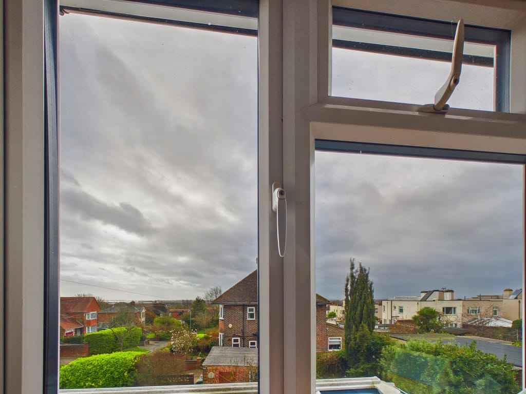 On the ground floor you will find a well-proportioned bedroom with fitted wardrobes, a contemporary shower room and a useful study area. From here, a fixed staircase leads to the first floor where the impressive principal bedroom is located, featuring a range of built-in wardrobes. This generous room benefits from en-suite facilities and enjoys lovely elevated sea views, providing a peaceful and private retreat.