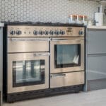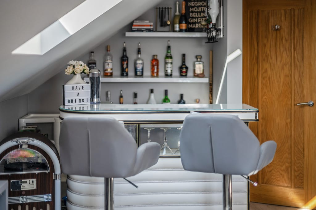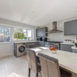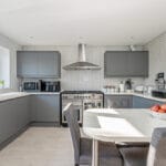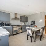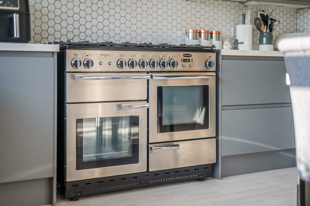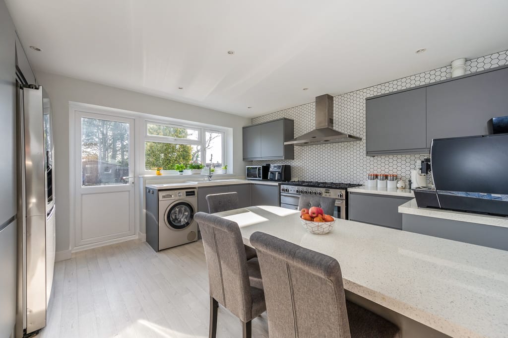 KITCHEN/BREAKFAST ROOM 13' 5" x 12' 8" (4.09m x 3.86m) This stunning modern kitchen offers an abundance of storage with a range of wall and base units. It features a Rangemaster oven with a gas hob and overhead extractor, set against a stylish panel-tiled walls. The ceramic sink with mixer tap overlooks the rear garden, dishwasher and space for washing machine. A breakfast bar provides a perfect casual dining spot, and the smooth ceiling with downlights completes the contemporary look.