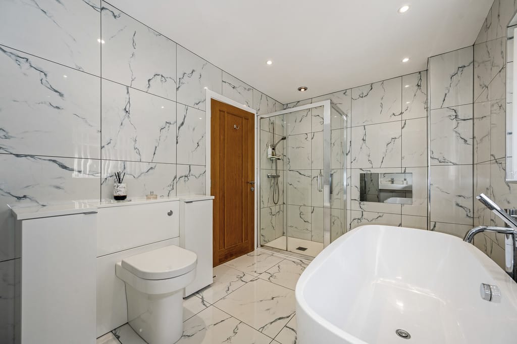 BATHROOM Step into pure luxury in this breathtaking bathroom. Fully tiled in elegant marble-look porcelain, it features a freestanding oval bath with mixer tap and hand shower, perfect for long, indulgent soaks. Twin hand basins with a large mirror and under units offer ample storage, while the low-level W.C. cleverly combines over-shelving with further storage. There is also a heated towel rail. The walk-in shower has sleek glass screens, a recessed TV lets you unwind in style-watch your favourite shows while feeling like you're staying in a five-star hotel. Every detail has been designed for comfort, elegance, and total relaxation.