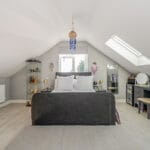 BEDROOM ONE 18' 3" x 16' 9" (5.56m x 5.11m) Light and airy, featuring two double-glazed Velux windows and an additional double-glazed window to the rear elevation. The space benefits from laminate flooring, a smooth ceiling with downlights, and an oak door leading into: