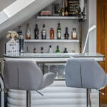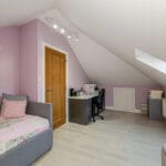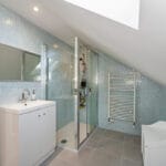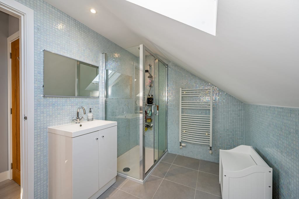 EN-SUITE Bathed in natural light from the Velux window, this stylish bathroom features a smooth ceiling with recessed down-lights, creating a bright and modern atmosphere. Feature tiled walls add texture and visual interest, while a walk-in double shower with a sleek glass screen offers a luxurious feel. The rectangular hand basin sits atop integrated storage and is complemented by an elegant overlying mirror. A low-level WC maintains the clean lines of the space and a heated towel rail adds both warmth and convenience, completing this contemporary, thoughtfully designed bathroom.