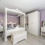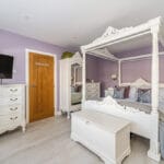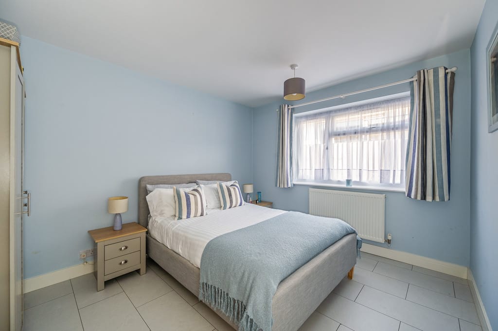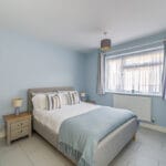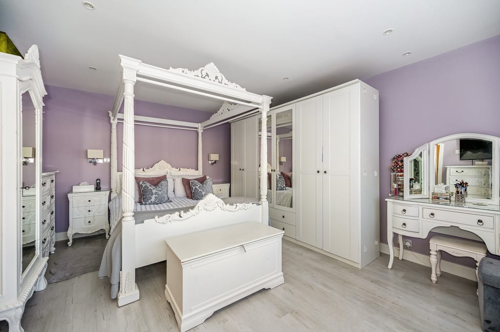 BEDROOM TWO 14' 11" x 12' 11" (4.55m x 3.94m) Spacious room with a large double-glazed window on the front elevation, allowing plenty of natural light. The interior features a soft, calming colour palette, smooth ceilings with recessed down-lights and laminate flooring for a sleek, modern finish. There is ample space for multiple wardrobes and storage solutions. Additional touches include a radiator and bedside wall lights for convenience and ambiance.