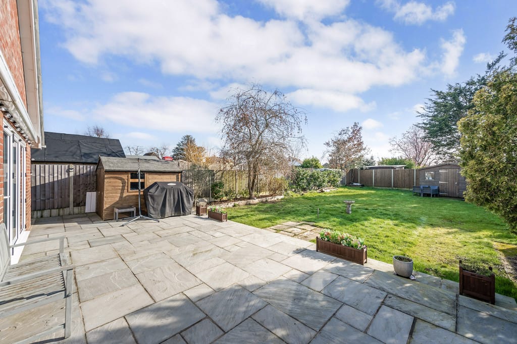 The rear garden is mainly laid to lawn with a good-sized terrace and also benefits from planning permission for a garden cabin.