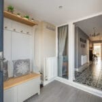 PORCH Double glazed porch full of light, with laminate flooring, radiator, and space for hanging coats and storing shoes. Smooth ceiling with downlights. Door leading into: