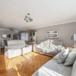 RECEPTION/DINING ROOM 23' 7" x 16' 1" (7.19m x 4.9m) Continuing the flow of natural tones, bi-fold doors with vertical blinds open seamlessly onto the terrace, bringing the outside in. The dining area features a double-glazed window to the side elevation, filling the space with natural light. It can be easily separated from the reception room via an oak door leading into the hallway. The room is finished with solid wood flooring, a smooth ceiling adorned with feature coving and a combination of pendant lighting and recessed down-lights, creating a warm, inviting atmosphere.