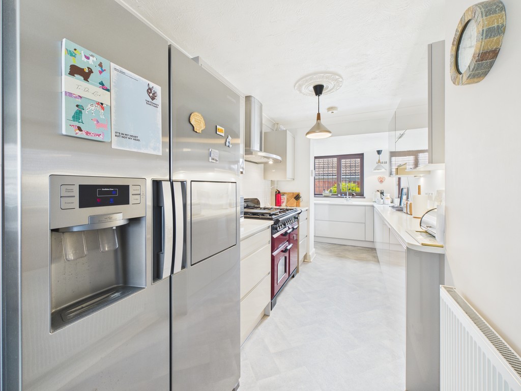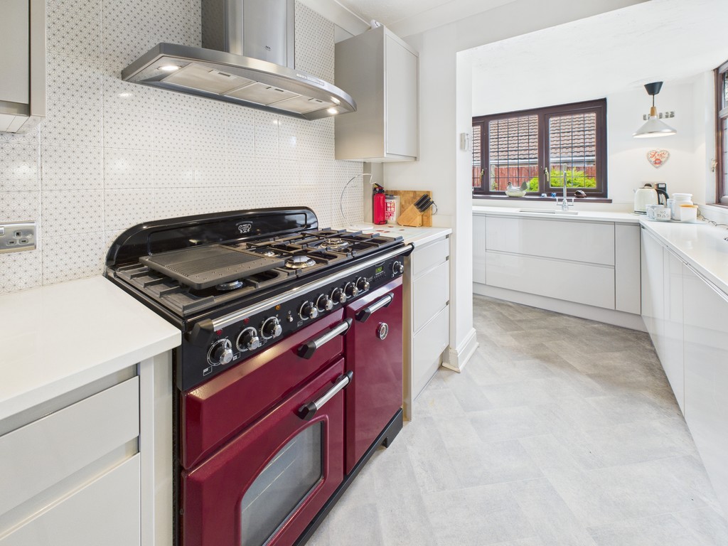 KITCHEN 17' 0" x 6' 9" (5.18m x 2.06m) 'L' shape with a variety of Wren shaker style gloss units and drawers, white kitchen worktops and kitchen sink draining area. Stainless steel sink unit with mixer tap. Free standing American style fridge/freezer, Rangemaster with overhead ceiling extractor, integral AEG dishwasher and space/plumbing for a washing machine. Vinyl flooring. Window on to side elevation overlooking the garden, leads to;