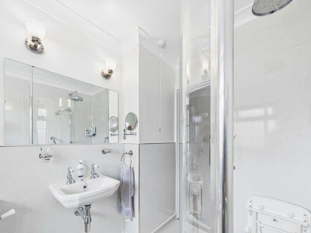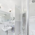 BATHROOM/WET ROOM 7' 0" x 5' 11" (2.13m x 1.8m) Fully refurbished by Brilliant Bathrooms in 2022, wet room with white furniture, comprising of; shower enclosure with wall mounted pull down seat, ceiling mounted drench shower and wall mounted mixer unit and hand held shower, pedestal wash hand basin with Victorian style taps, low level WC with side pull down flush, wall mounted Victorian style radiator, anti-slip flooring, ceiling spot lights.