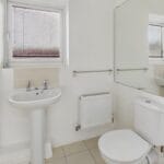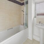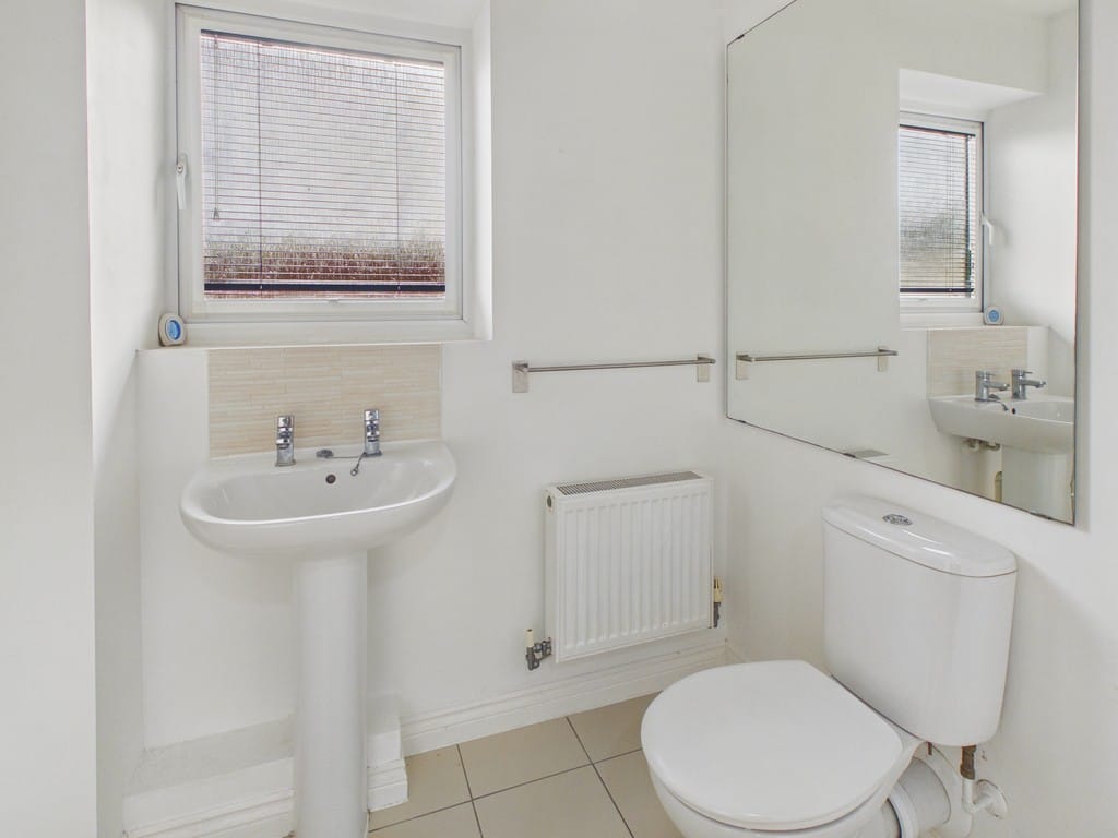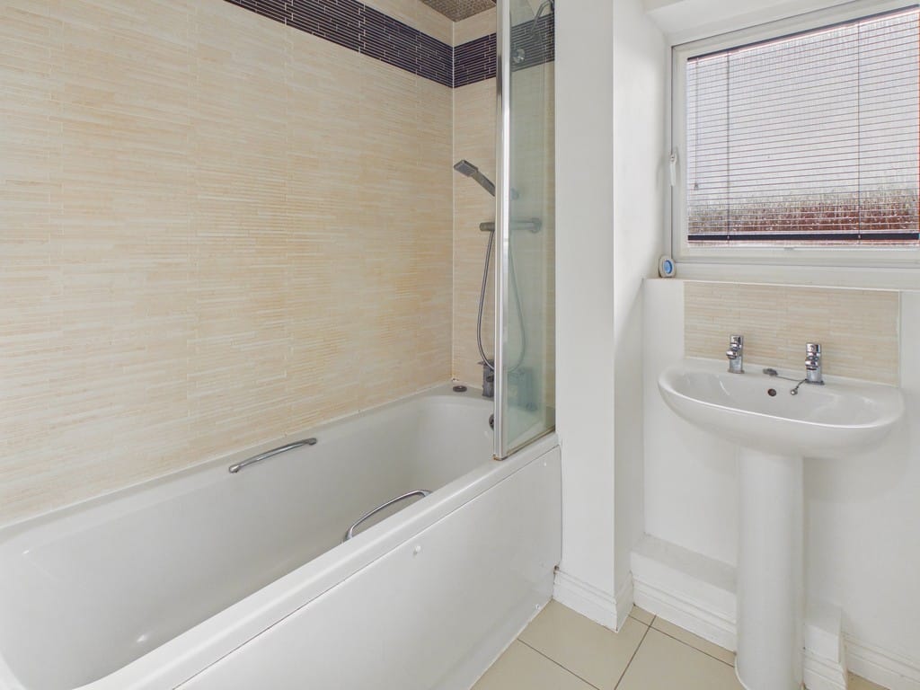 BATHROOM 8' 0" x 5' 6" (2.44m x 1.68m) Neutral suite comprising of a panelled bath with mixer tap, wall mounted shower and shower screen, pedestal wash hand basin, close coupled low level w.c, double glazed obscured window to rear aspect, tiled flooring to principal areas, large feature wall mirror, radiator and smooth ceiling.