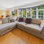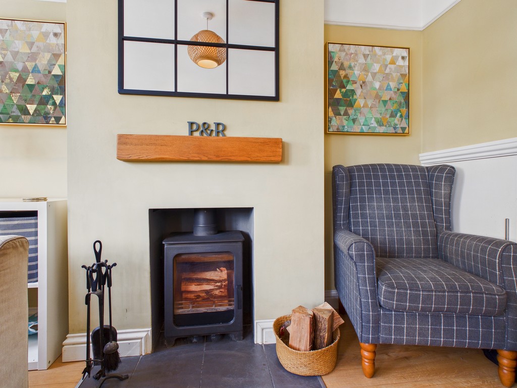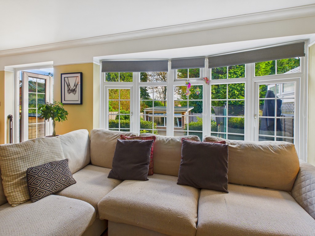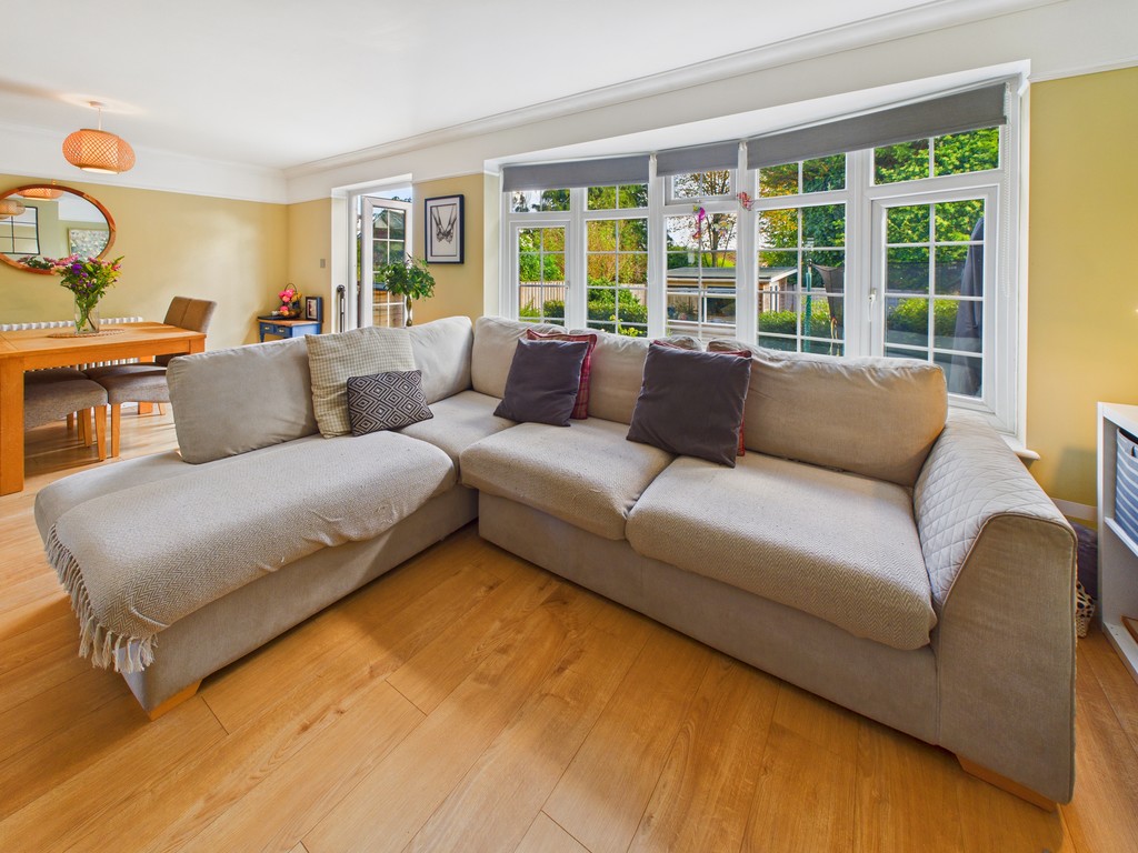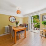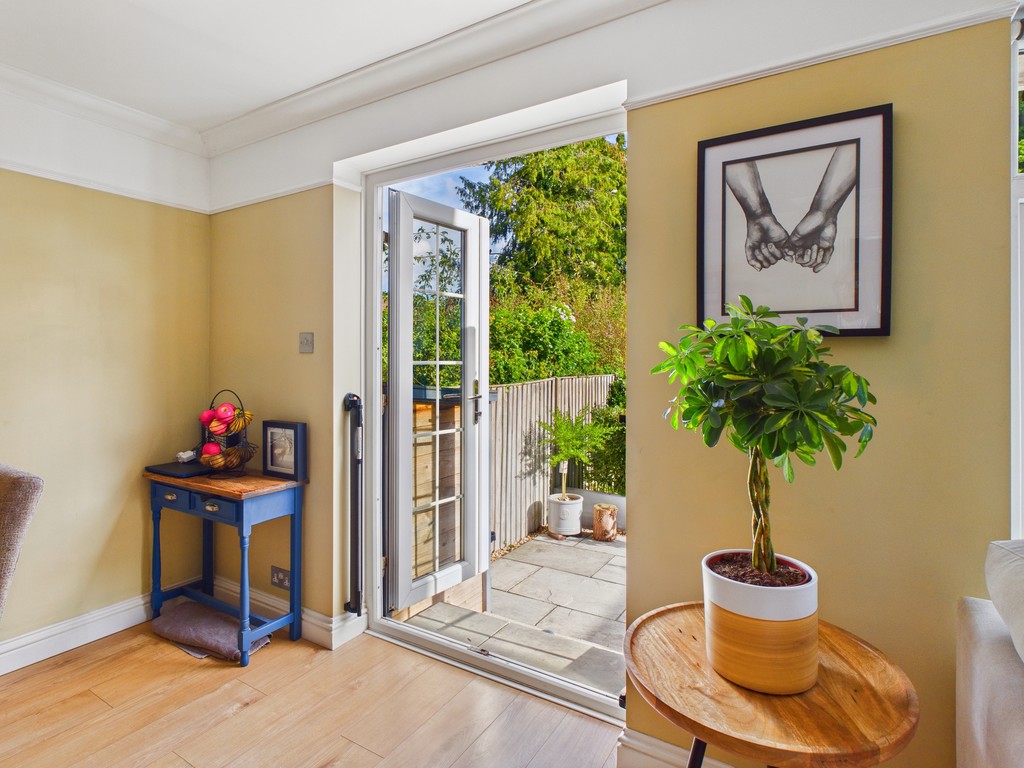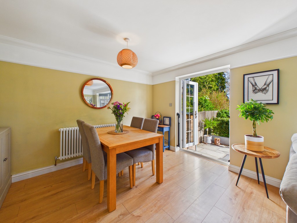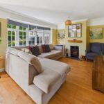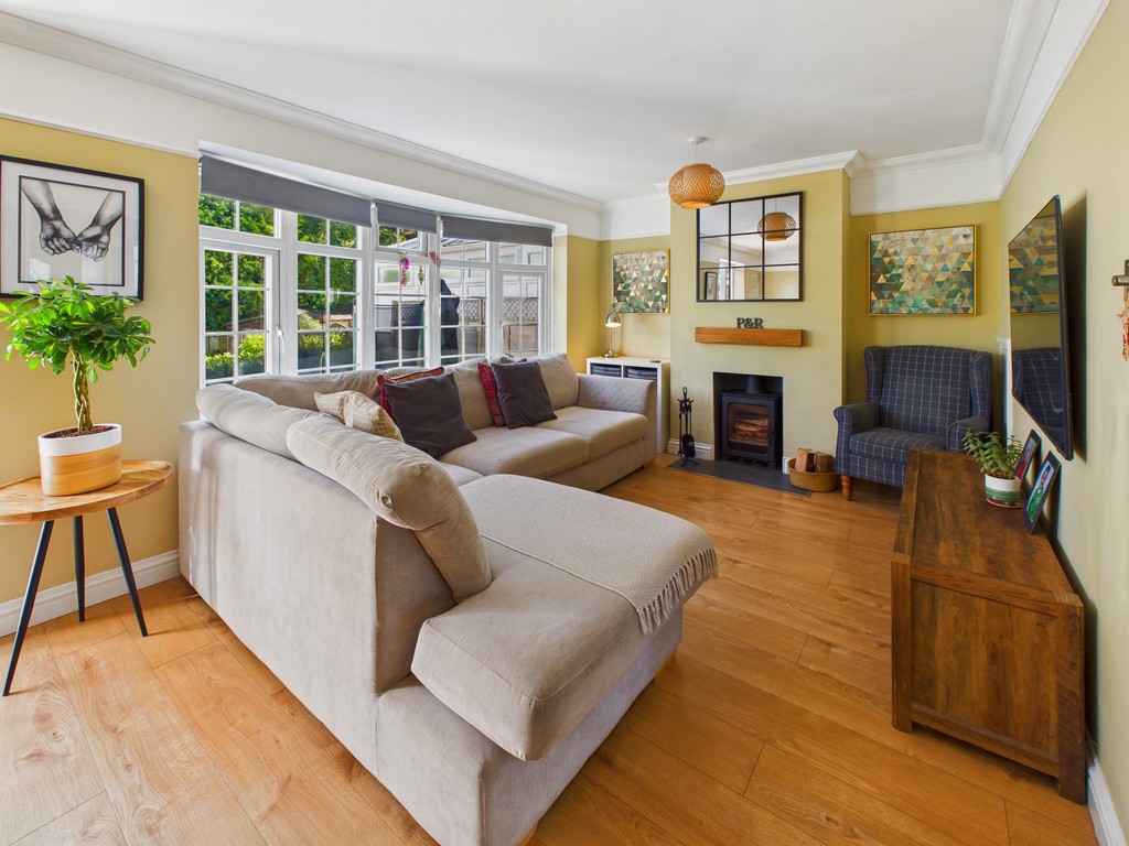 RECEPTION/DINING ROOM 21' 1" x 10' 0" (6.43m x 3.05m) This bright and inviting living area features a double-glazed bay window with blinds and patio doors that open seamlessly onto the terrace, creating a perfect flow between indoor and outdoor spaces. A log burner adds warmth and character, while laminate flooring and a modern radiator provide a stylish, contemporary finish throughout