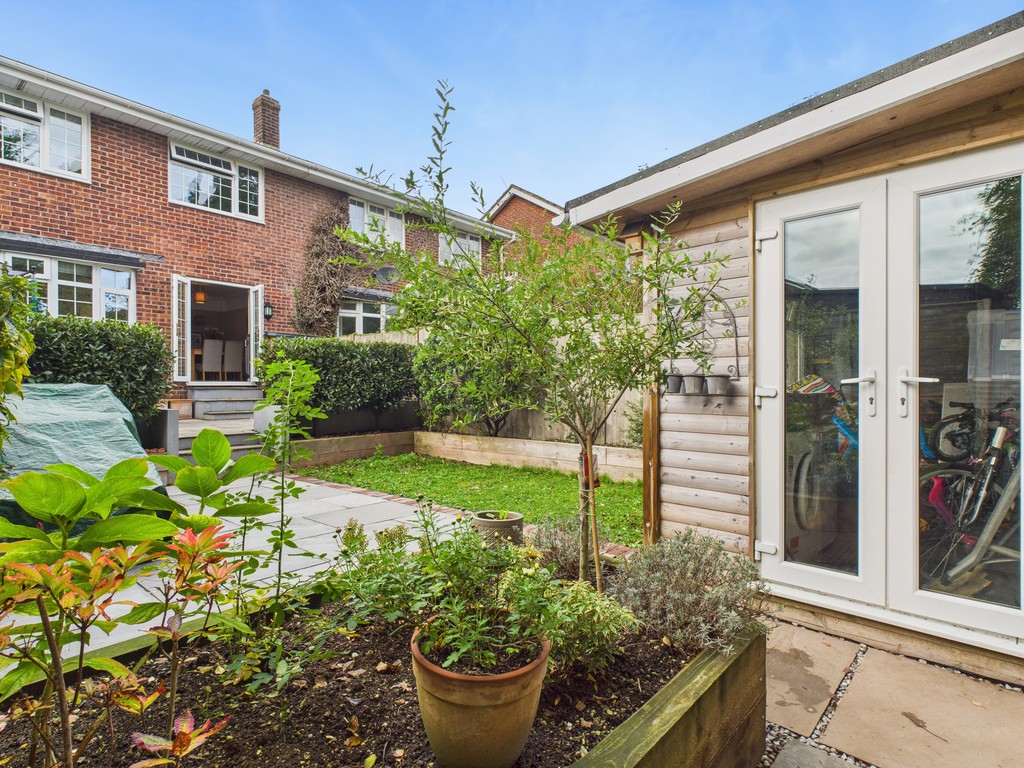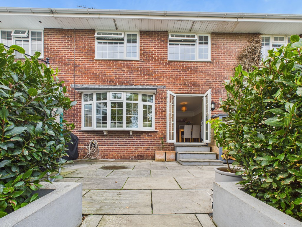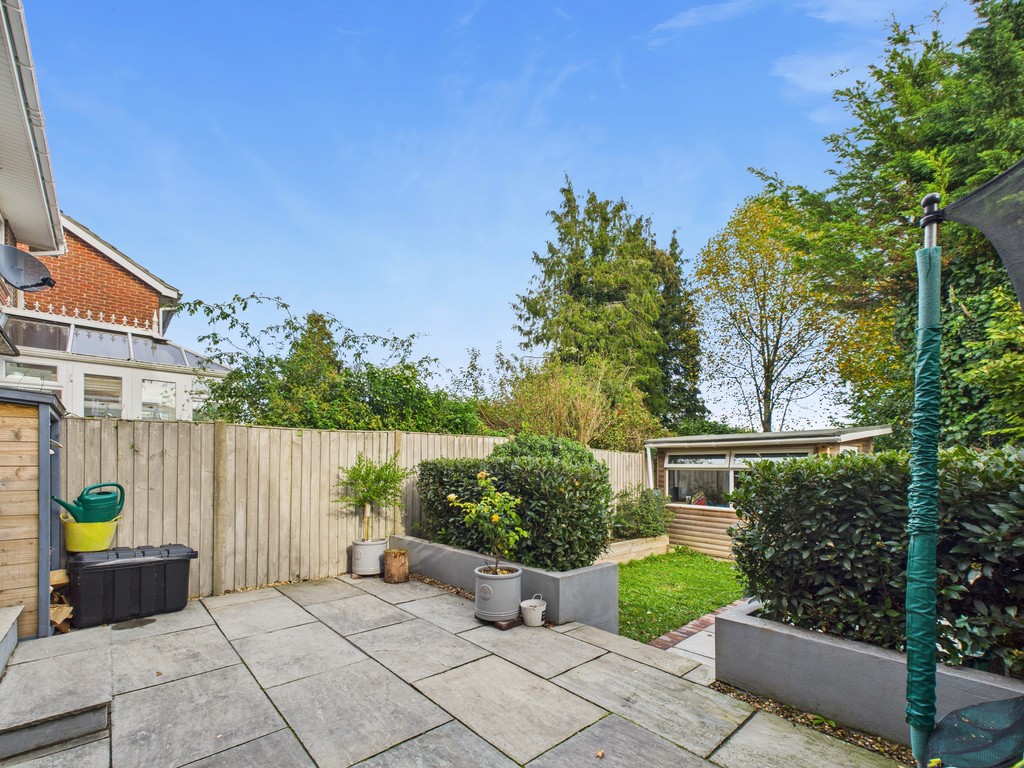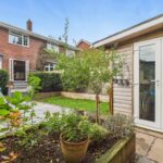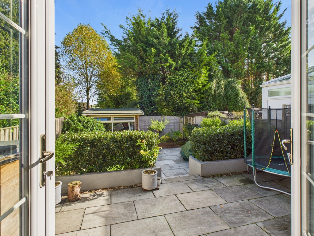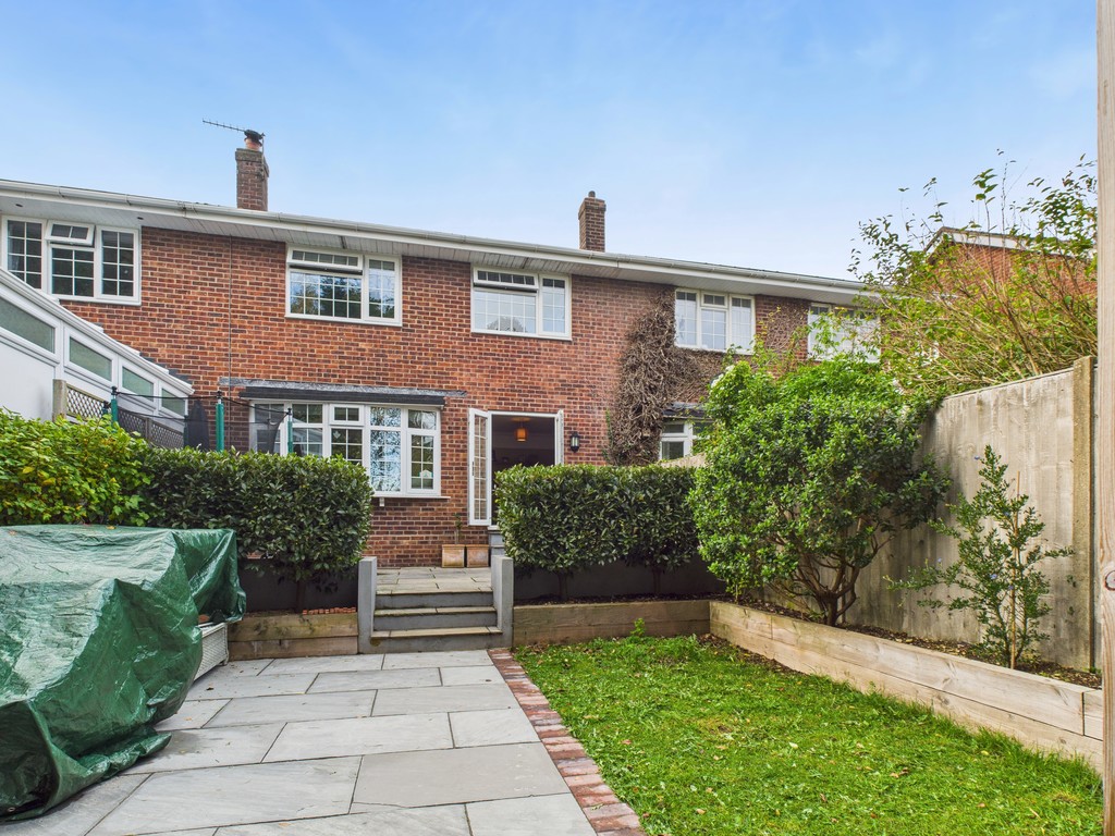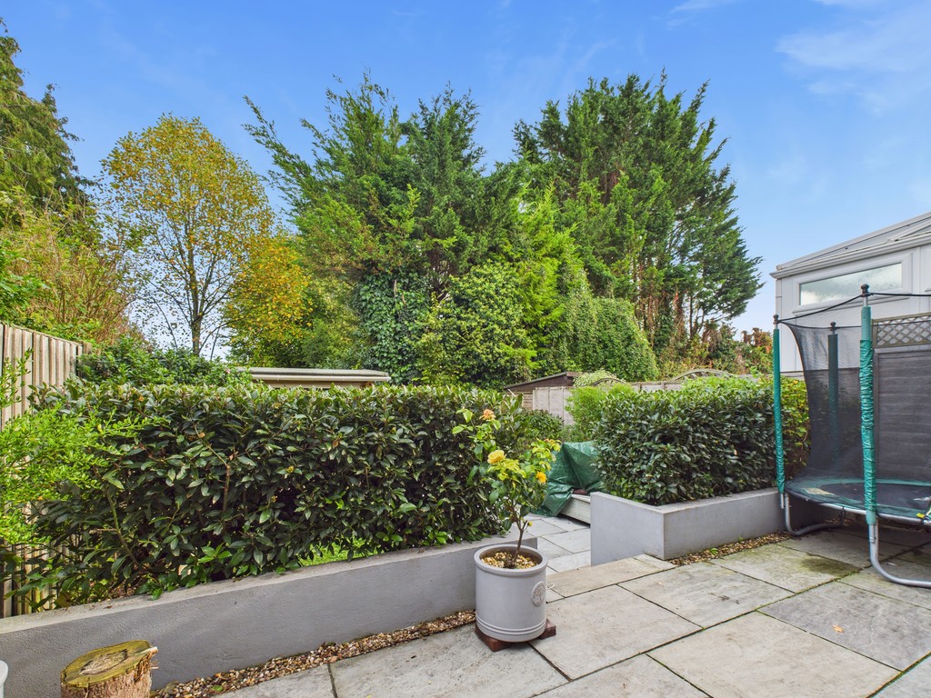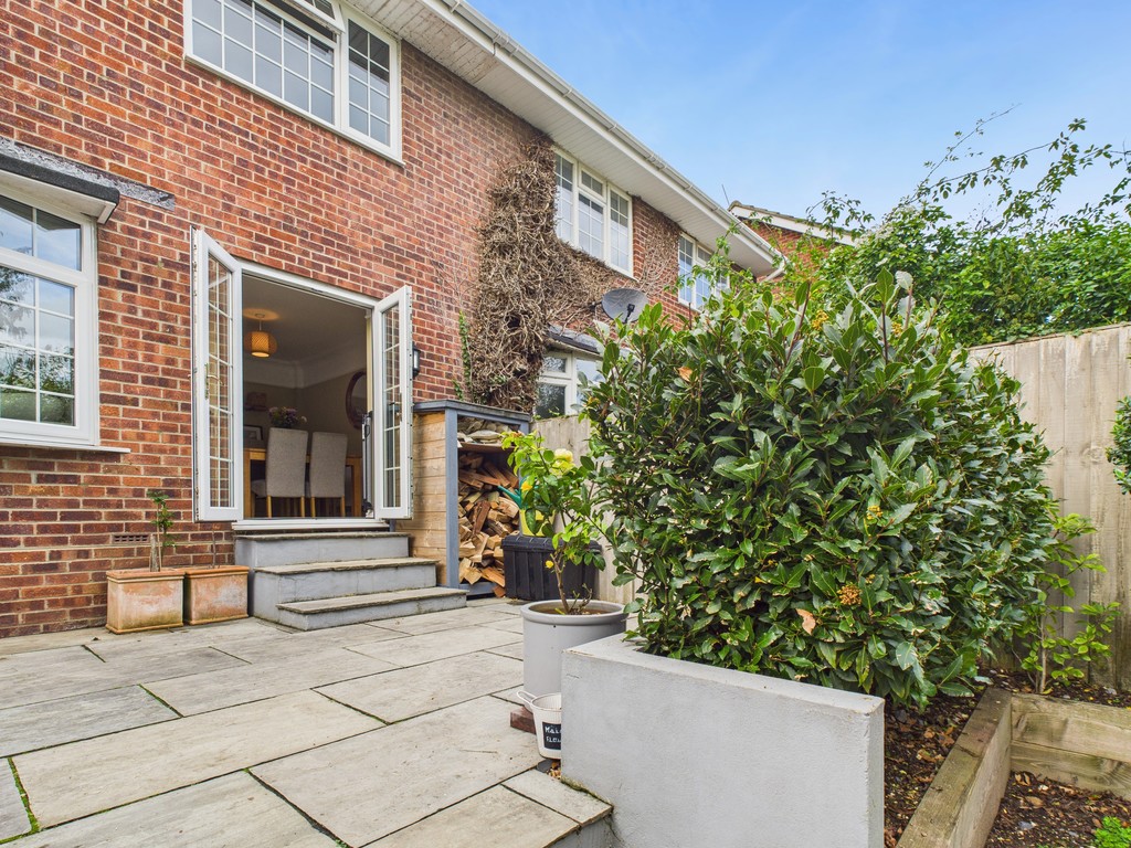 REAR GARDEN A beautiful, low-maintenance garden featuring a stone terrace that steps down to well-kept lawns. The space is enhanced by raised feature beds and mature borders, a convenient log store, an outdoor tap, and a gate providing access to the front of the property