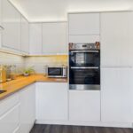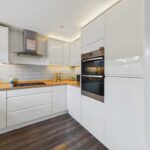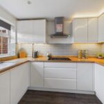 KITCHEN 9' 8" x 7' 11" (2.95m x 2.41m) Modern kitchen featuring a range of wall and base units with feature lighting, oak work surfaces with a tiled splash-back, fridge freezer, double oven, gas hob with overhead extractor, space for a washing machine and laminate flooring.