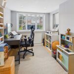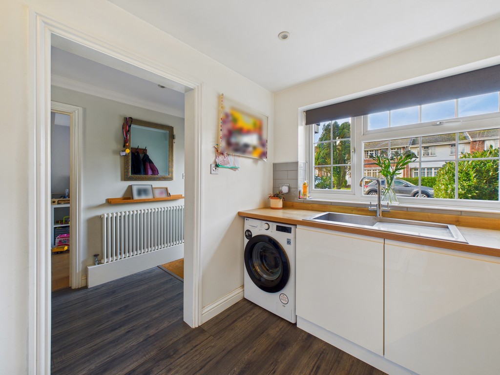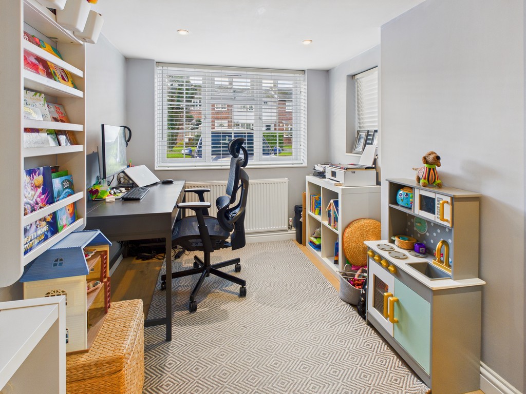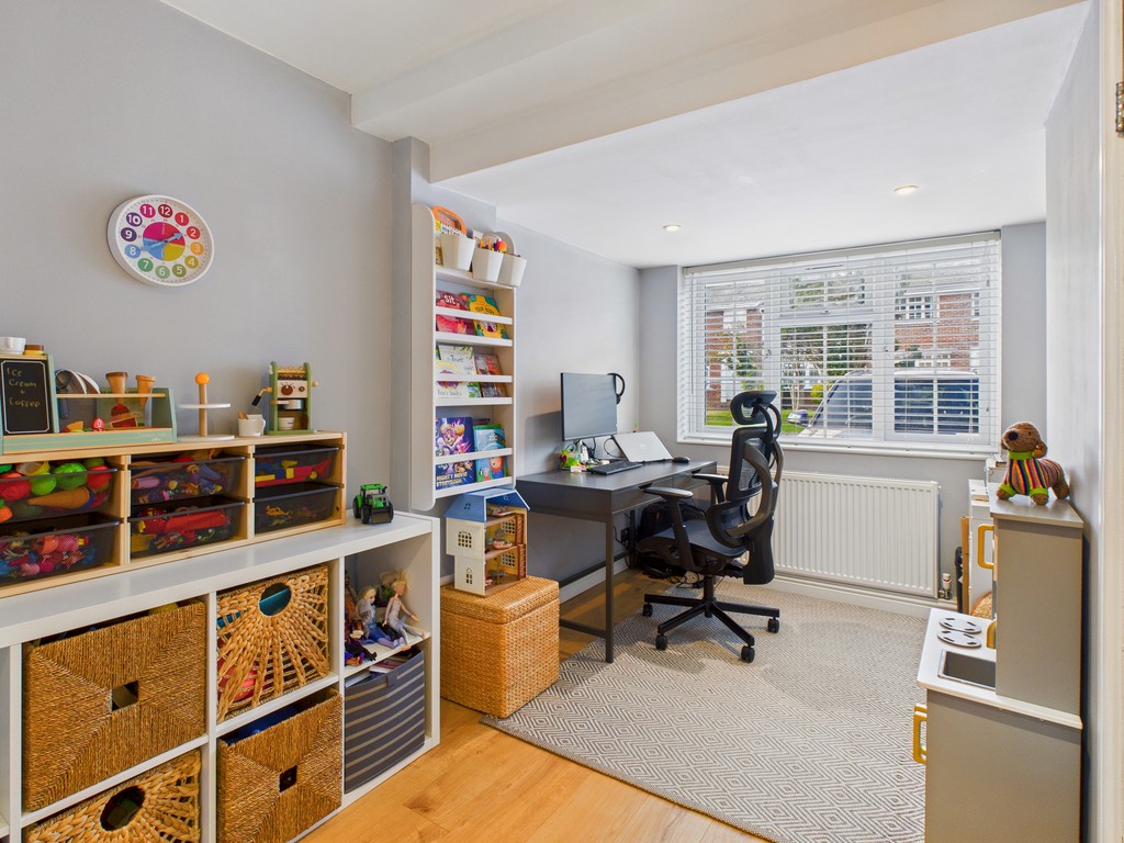 SNUG/OFFICE 14' 11" x 7' 7" (4.55m x 2.31m) Originally a garage, this space has been fully converted in compliance with all regulations. The front elevation features a double-glazed window with a blind. Inside, there is laminate flooring, recessed ceiling downlights, and a cupboard housing the utility meters.