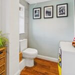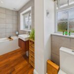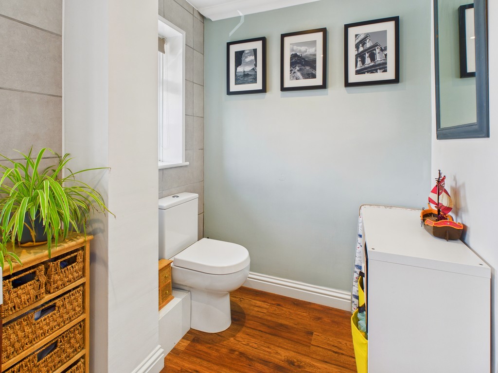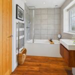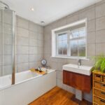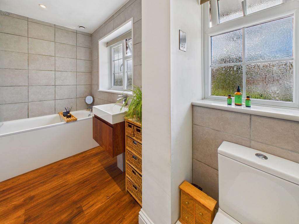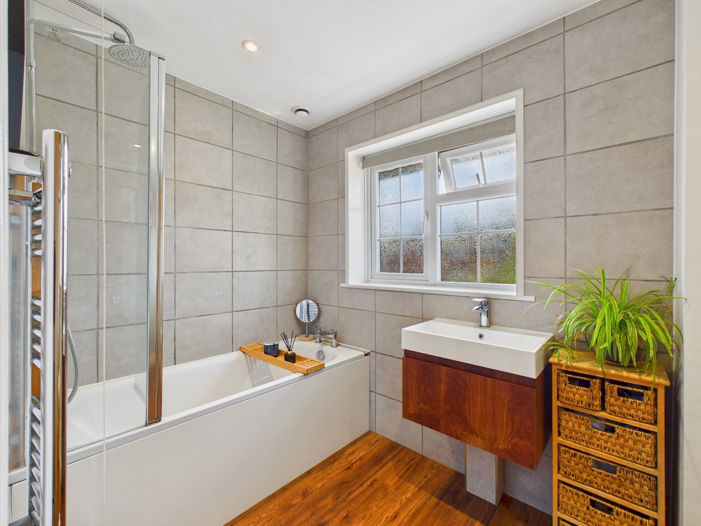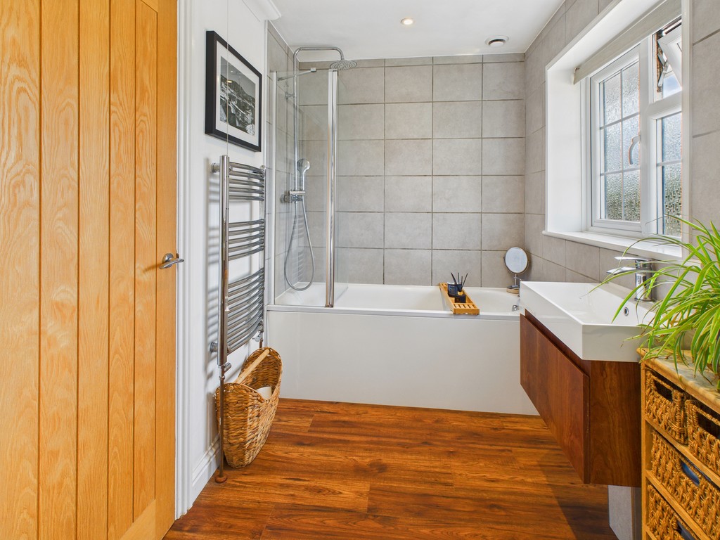 FAMILY BATHROOM 11' 1" x 5' 8" (3.38m x 1.73m) With two double-glazed windows, this light-filled bathroom features a panel bath with monsoon shower and glass screen, a floating rectangular hand basin with under-storage, a low-level WC, heated towel rail, laminate flooring, and recessed downlights
